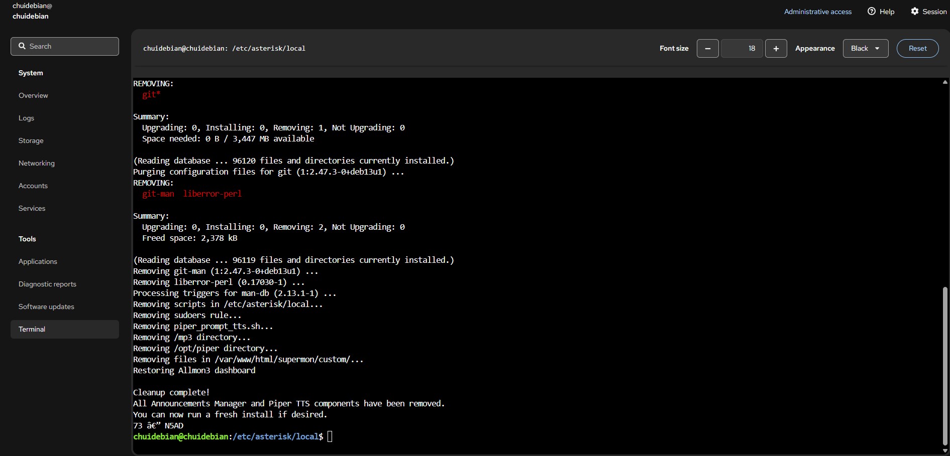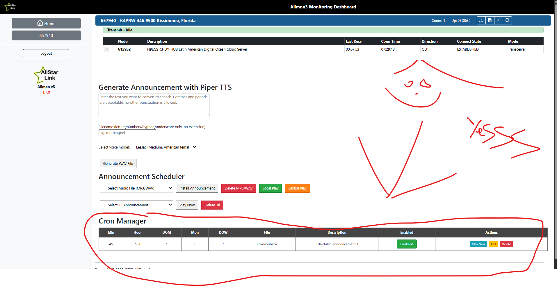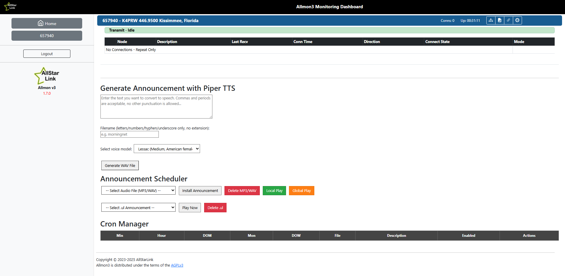 Yes I do. This is how it looks right now on both, the supermon monitoring dashborad and the allmon3 monitoring dashboard (Check screenshots). Once I generate the announcement with Piper TTS it shows a green message with a recorded path with the name I gave but it is not showing anything at the SELECT AUDIO FILE MP3/WAV part. This is because the installation was not successful stopping at the 15 step wih that exec format error at the end. Freddy was making all of this using a script that was made for cloud service using a server to download and move his audio files. I am not. I am using my thinWyse 5070 in my home with no cloud service to connect my node. My friend I am stuck right there with the script because I know I can fork and copy the script and make any modification on github but I have no idea where to make that change. Any help will be appreciated.