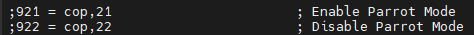 This uses COP command number 21 to enable, and 22 to disable. This will make it parrot all the time if enabled.