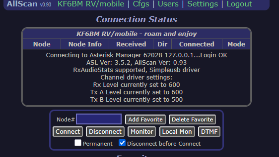 Clifford, you didn't list all the messages in the log window. It will say there what files the AMI configs were read from. And as I mentioned you don't have the current version of AllScan installed. As stated on the github page, you should always update to the latest version before submitting any tech support request. When you do an update, not only is AllScan itself updated but the installer also checks the file system and will validate the config file locations and permissions. Last, please do not use this thread or the ASL forum for AllScan tech support questions. Tech support questions should be emailed to me. Thank you.
