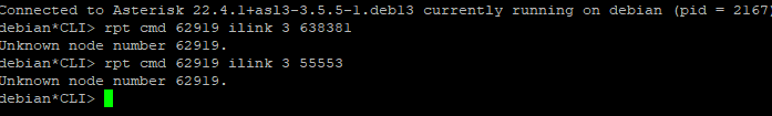 Im also having the same issue. I have created a debian 13 virtual machine with asl3 and after adding a node and setting up zoiper, I also have unknown node number issue. The node is registered and I tried adding a private node 1999 to connect the two as well but I got unknown for both nodes 62919 and 1999.
